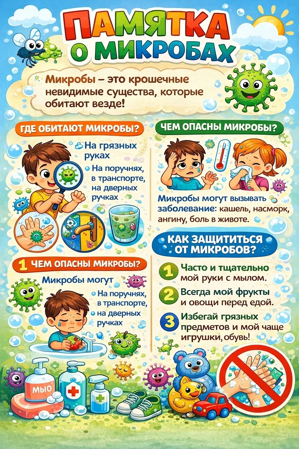Микробы — это крошечные, невидимые глазу живые существа (бактерии и вирусы), обитающие повсюду: на руках, игрушках и еде. Хотя большинство из них безвредны, некоторые вызывают болезни.
