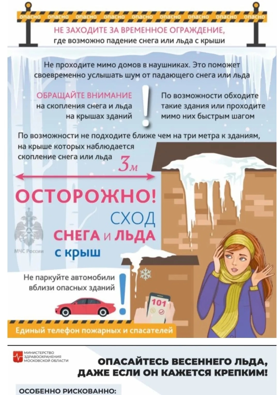 Необходимо избегать нахождения рядом со зданиями, не парковать машины под карнизами, обращать внимание на ограждения.Основные правила безопасности при сходе снега:Избегайте опасных зон: